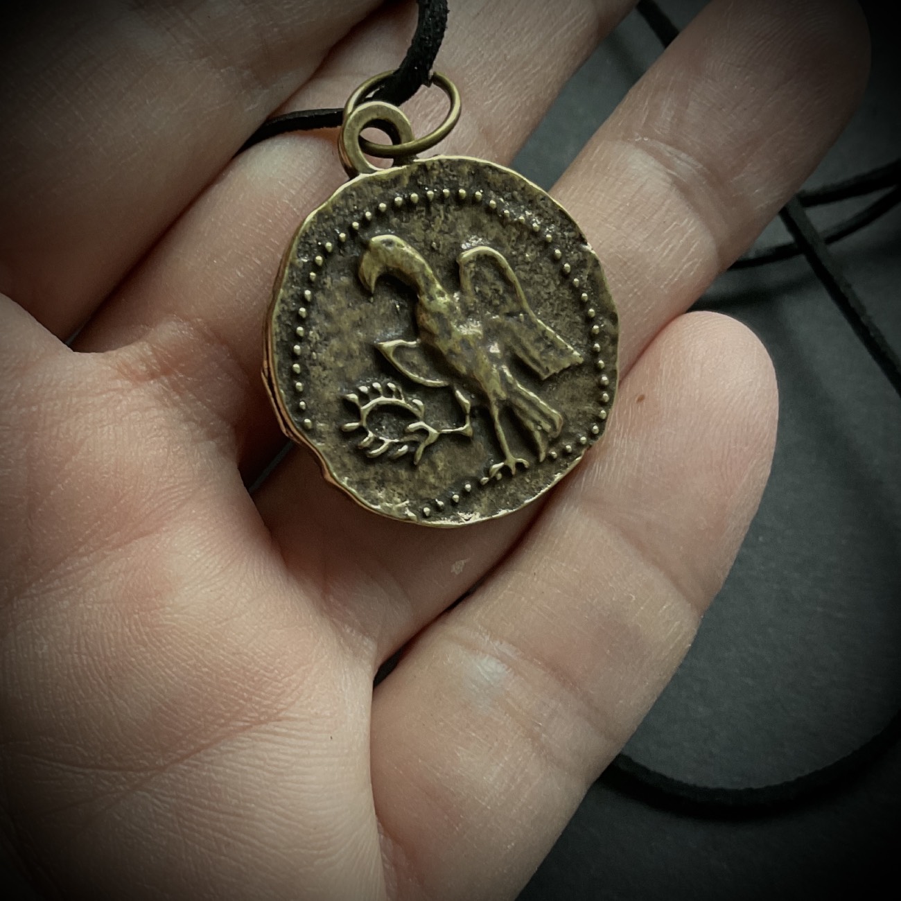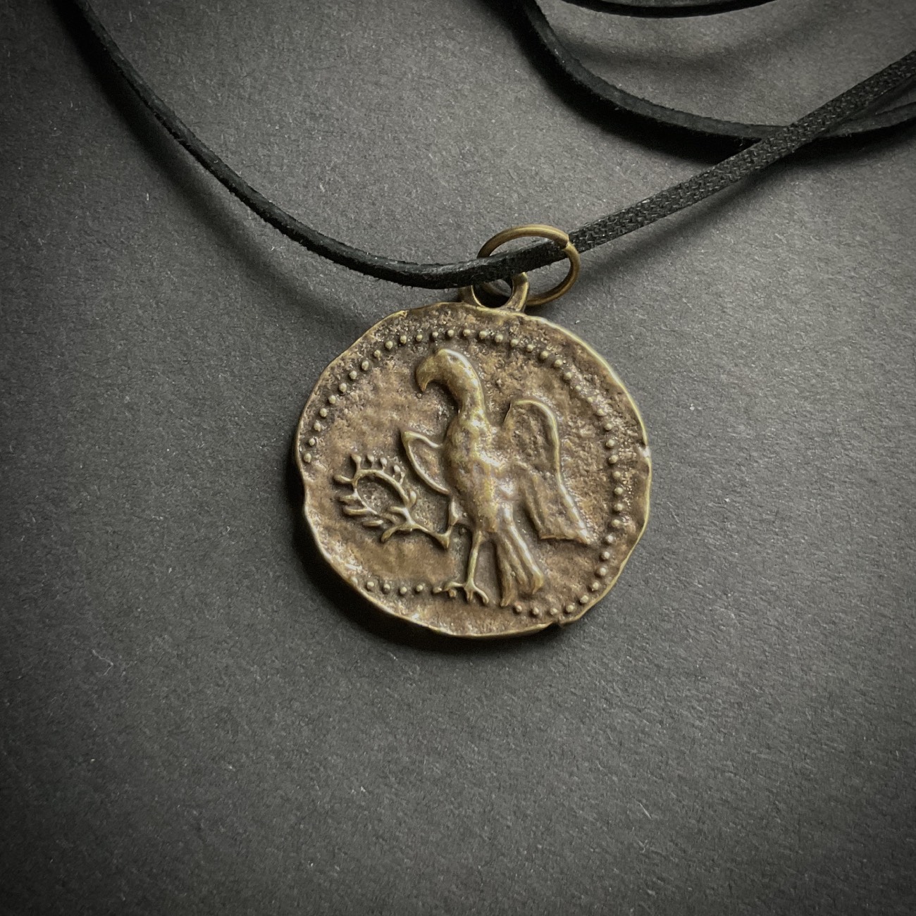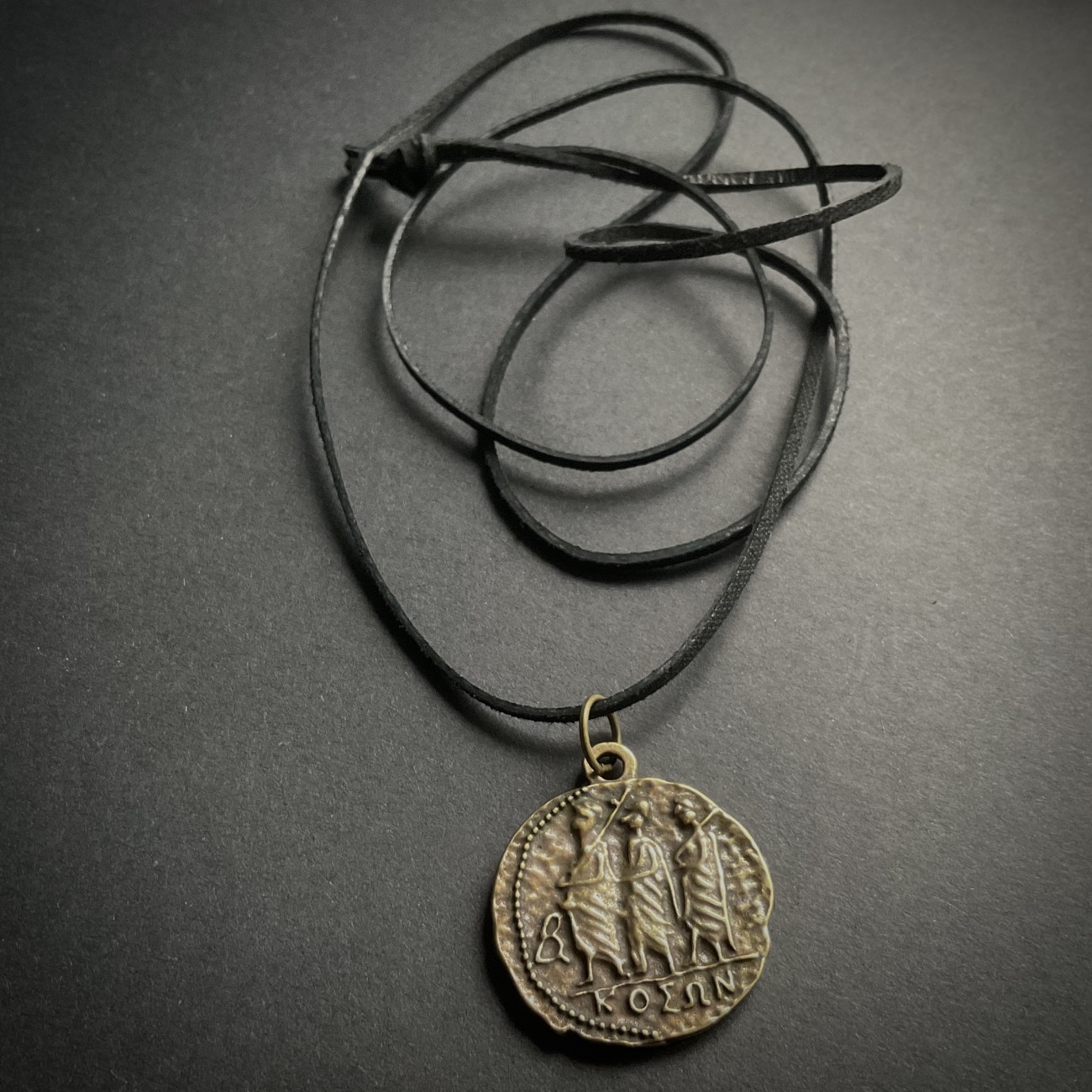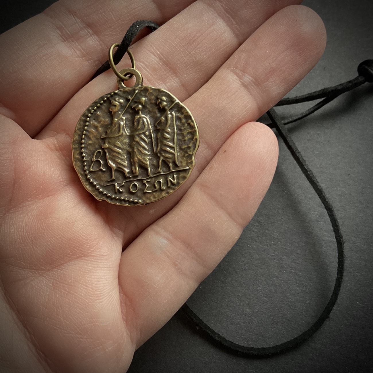 Inspirat de celebrele monede dacice de aur cu inscripția Koson, acest pandantiv redă cu finețe detaliile unor artefacte dacice de prestigiu. Realizată din alamă cu șnur de piele, piesa evocă forța și misterul lumii antice, fiind potrivită pentru purtare zilnică.