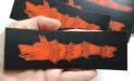 Autocolant lup dacic roșu pe fond negru, material rezistent.